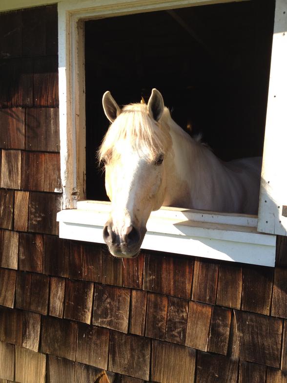 The Dark Brown Quarter Horse is Bailey (Mary’s Horse). The White Horse, Lilly, had her head out of the window the whole time right next to where the children were having their cake.