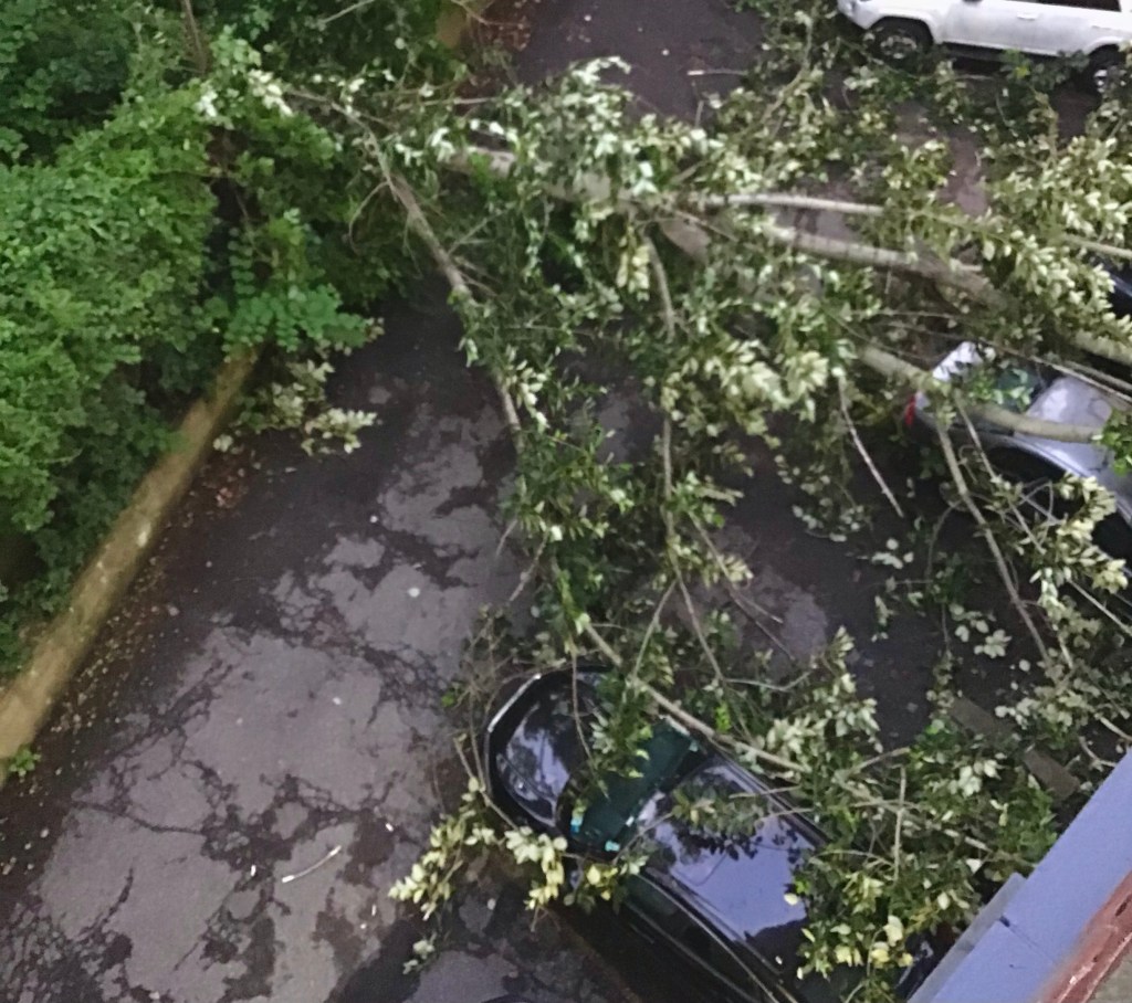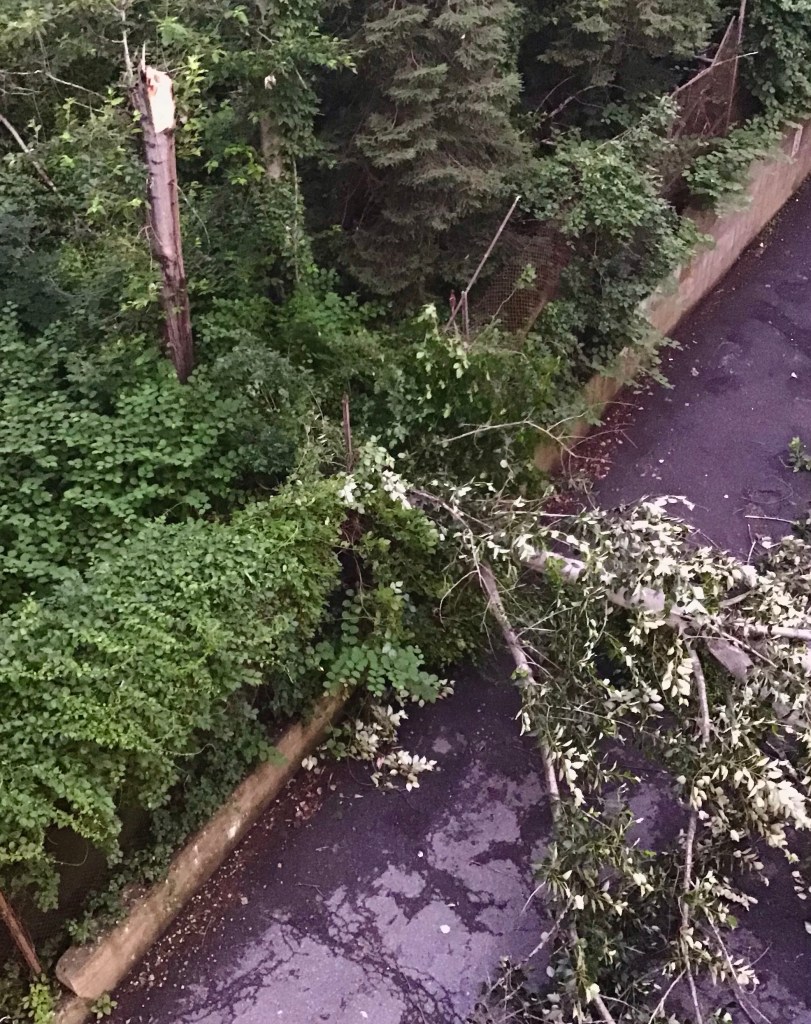 More heavy rains thunder lightening again this evening! They town spent most of the removing not only the fallen tree, but many more also. Three cars were crushed. It really woke up the neighborhood!