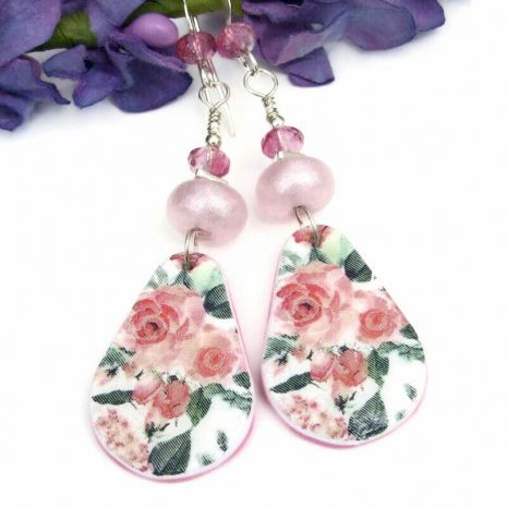 Shadow Dog Designs – Pink Roses Floral Earrings/Lampwork Beads