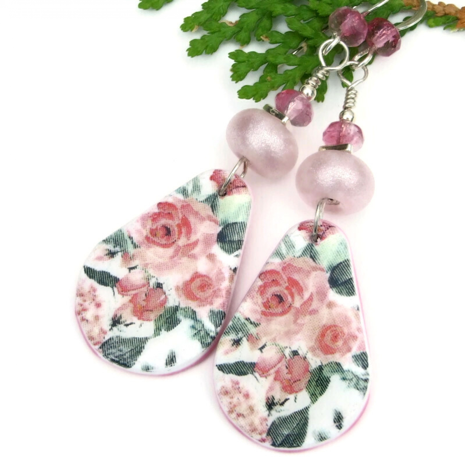 Shadow Dog Designs – Pink Roses Floral Earrings/Lampwork Beads